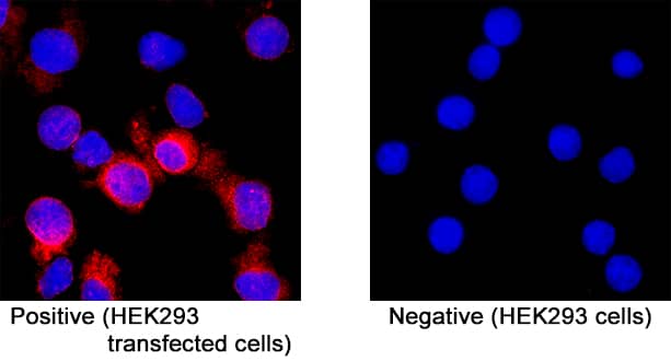 Spike S1 Subunit was detected in immersion fixed HEK293 human embryonic kidney cell line transfected with SARS-CoV-2 Spike S1 (positive staining) and HEK293 human embryonic kidney cell line (non-transfected, negative staining) using Rabbit Anti-SARS-CoV-2 Spike S1 Subunit Monoclonal Antibody (Catalog # MAB105407) at 3 µg/mL for 3 hours at room temperature. Cells were stained using the NorthernLights™ 557-conjugated Anti-Rabbit IgG Secondary Antibody (red; NL004) and counterstained with DAPI (blue). Specific staining was localized to cell cytoplasm. Staining was performed using our protocol for Fluorescent ICC Staining of Non-adherent Cells.