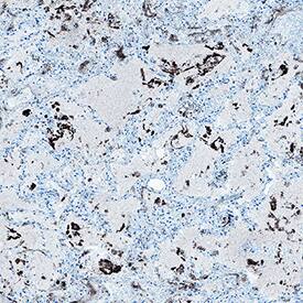 Spike S1 Subunit was detected in immersion fixed paraffin-embedded sections of SARS-CoV-2 infected Human Lung using Rabbit Anti-SARS-CoV-2 Spike S1 Subunit Monoclonal Antibody (Catalog # MAB105407) at 3 µg/mL for 1 hour at room temperature followed by incubation with the Anti-Rabbit IgG VisUCyte™ HRP Polymer Antibody (VC003). Before incubation with the primary antibody, tissue was subjected to heat-induced epitope retrieval using Antigen Retrieval Reagent-Basic (CTS013). Tissue was stained using DAB (brown) and counterstained with hematoxylin (blue). Specific staining was localized to immunoreactive profiles scattered throughout the tissue. Staining was performed using our protocol for IHC Staining with VisUCyte HRP Polymer Detection Reagents.