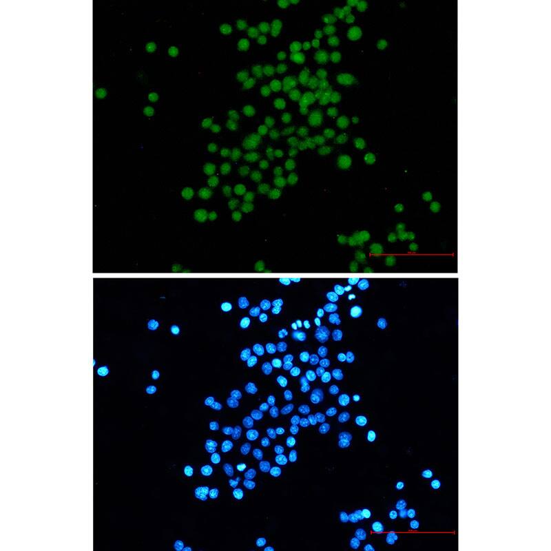 Immunocytochemistry/ Immunofluorescence: SV40 T-antigen Antibody (SR2545) [NBP3-27808] - Immunocytochemistry analysis of SV40 T-antigen (green) in HeLa using NBP3-27808, and DAPI (blue)Applications for SV40 T-antigen Antibody (SR2545)