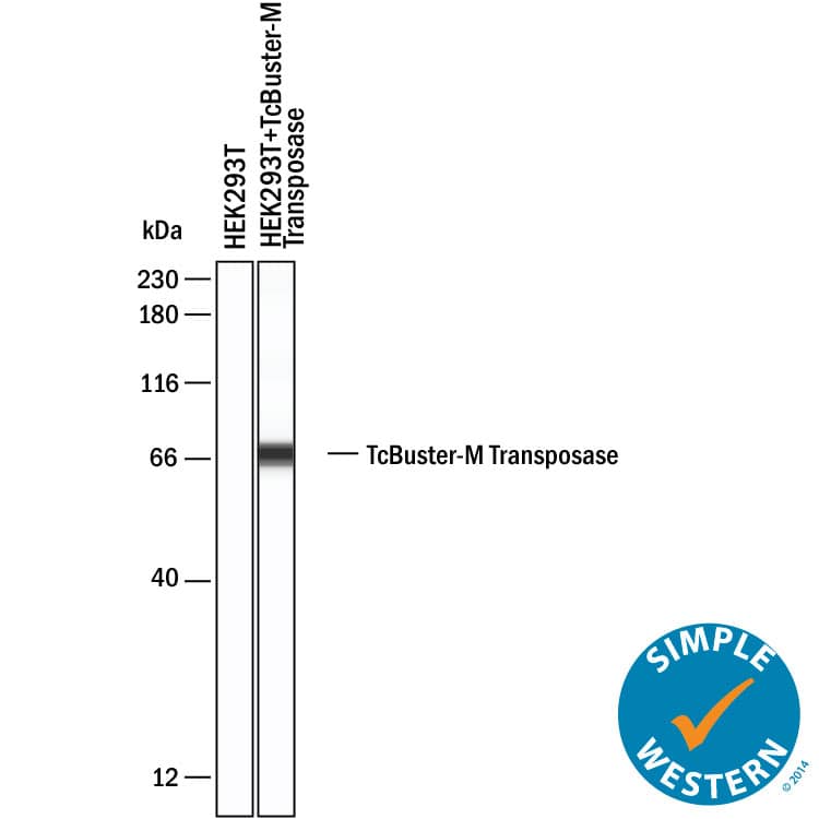 Western Blot shows lysates of HEK293T human embryonic kidney cell line mock electroporated or electroporated with 1 µg TcBuster-M Transposase after 1 day post-electroporation. PVDF membrane was probed with 1 µg/ml of Mouse Anti-TcBuster-M Transposase Monoclonal Antibody (Catalog # MAB11511) followed by HRP-conjugated Anti-Mouse IgG Secondary Antibody (Catalog # HAF018). A specific band was detected for TcBuster-M Transposase at approximately 70 kDa (as indicated). This experiment was conducted under reducing conditions and using Western Blot Buffer Group 1.Detection of TcBuster-M Transposase by Simple WesternTM.