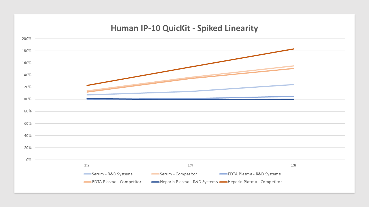 IP-10 is spiked at high concentration in various matrices and diluted with appropriate Calibrator Diluent to produce samples with values within the dynamic range of the assay. The linearity is between 99%-124% compared to 112%-183% for the top competitor.Preparation and Storage