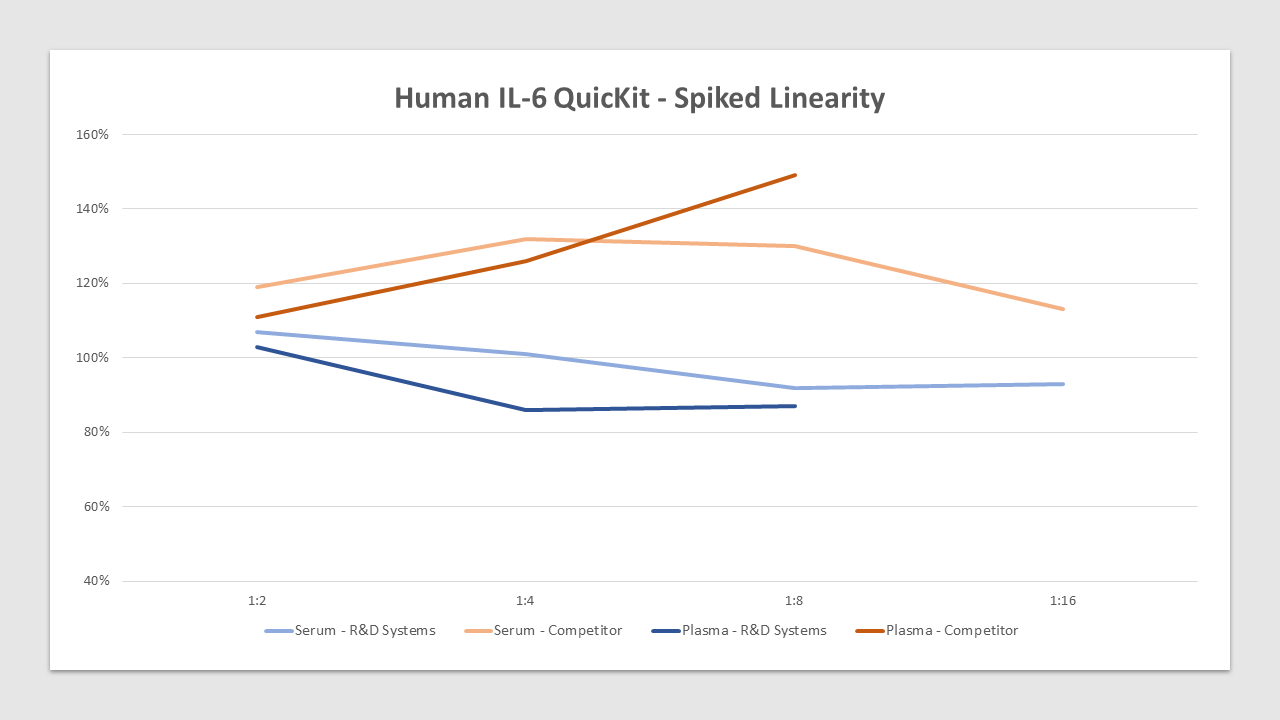 IL-6 is spiked at three known concentrations throughout the range of the assay and run to measure response of the spiked sample matrix. Serum recovery is 109% compared to 68% for the top competitor. Plasma recovery is 113% compared to 77% for the top competitor.Human IL-6 QuicKit Spiked Linearity Competitor Comparison