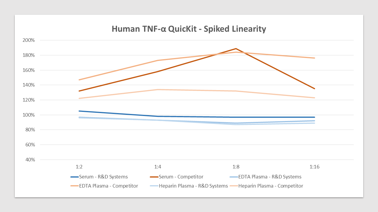 To assess linearity of the assay, samples containing and/or spiked with high concentrations of human TNF-alpha in various matrices were diluted with the calibrator diluent to produce samples with values within the dynamic range of the assay.