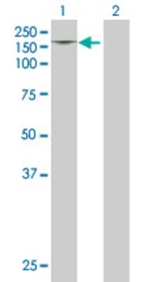 Lane 1: PDGFRA transfected lysate (122.7 KDa) Lane 2: Non-transfected lysate.