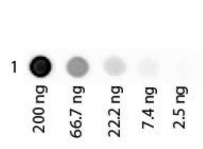 Dot Blot: Albumin Native Protein [NBP1-97049] - Human Albumin Rhodamine Conjugated. Antigen: Rhodamine Conjugated Human Albumin. Load: 3-fold serial dilution starting at 200 ng. Primary antibody: None. Secondary antibody: None. Block for 1 HR at RT.. Using the Rhodamine format of this antibody.