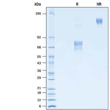 2 μg/lane of Recombinant Canine PD-L1/B7-H1 Fc Chimera (Catalog # 10746-B7) was resolved with SDS-PAGE under reducing (R) and non-reducing (NR) conditions and visualized by Coomassie® Blue staining, showing bands at 60-80 kDa and 120-160 kDa, respectively.Formulation, Preparation and Storage