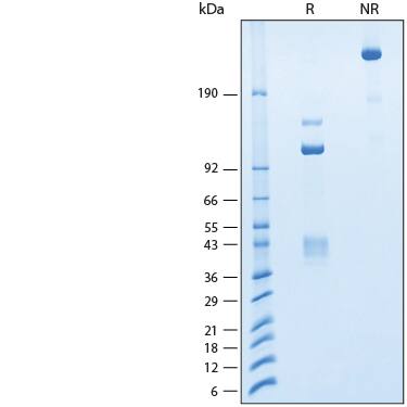 2 μg/lane of Recombinant Cynomolgus HGFR/c-MET Fc Chimera Protein (Catalog # 11267-ME) was resolved with SDS-PAGE and visualized by Coomassie® Blue staining, showing bands at 135-150 kDa, 40-45 kDa, and 103-115 kDa under reducing (R) conditions and a single band at 270-310 kDa under non-reducing (NR) conditions.Formulation, Preparation and Storage