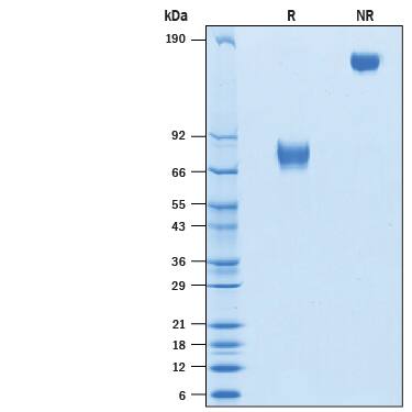 2 μg/lane of Recombinant Cynomolgus Monkey Mesothelin (aa 417-693) Fc Chimera (Catalog # 10760-MS) was resolved with SDS-PAGE under reducing (R) and non-reducing (NR) conditions and visualized by Coomassie® Blue staining, showing bands at 65-85 kDa and 130-170 kDa, respectively.Formulation, Preparation and Storage