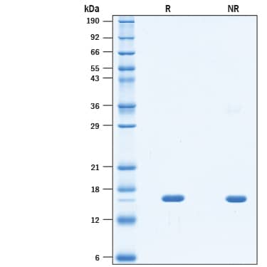 2 μg/lane of Recombinant Cynomolgus Monkey TNF-alpha (Catalog # 10765-TA) was resolved with SDS-PAGE under reducing (R) and non-reducing (NR) conditions and visualized by Coomassie® Blue staining, showing bands at 15-17 kDa.Formulation, Preparation and Storage