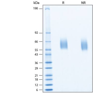 2 μg/lane of Recombinant Cynomolgus/Rhesus Tyro3/Dtk His-tag Protein (Catalog # 11301-DT) was resolved with SDS-PAGE under reducing (R) and non-reducing (NR) conditions and visualized by Coomassie® Blue staining, showing bands at 55-64 kDa.Formulation, Preparation and Storage