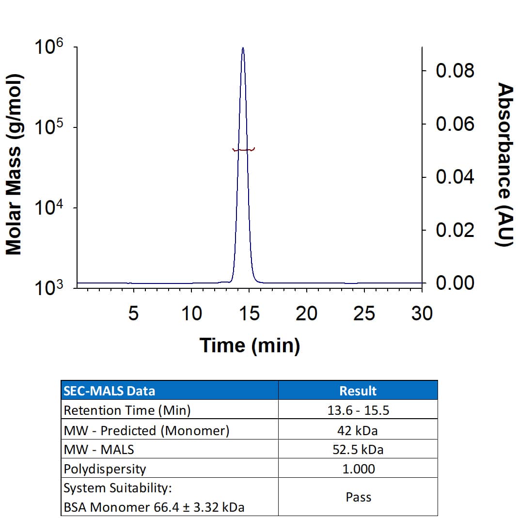 Recombinant Cynomolgus Monkey/Rhesus Macaque Tyro3/Dtk His-tag Protein (Catalog # 11301-DT) has a molecular weight (MW) of 52.5 kDa as analyzed by SEC-MALS, suggesting that this protein is a monomer. MW may differ from predicted MW due to post-translational modifications (PTMs) present (e.g. Glycosylation).Recombinant Cynomolgus/Rhesus Tyro3/Dtk His-tag Protein Binding Activity.