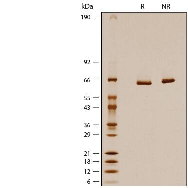 1 μg/lane of Recombinant Human 5'-Nucleotidase/CD73 His-tag Avi-tag Protein (Catalog # AVI5795) was resolved with SDS-PAGE under reducing (R) and non-reducing (NR) conditions and visualized by silver staining, showing bands at 60-66 kDa.Formulation, Preparation and Storage
