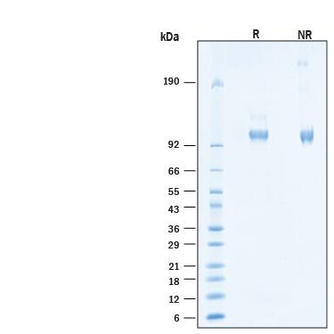 2 μg/lane of Recombinant Human ACE‑2 His-tag Alexa Fluor® 488 Protein (Catalog # AFG933) was resolved with SDS-PAGE under reducing (R) and non-reducing (NR) conditions and visualized by Coomassie® Blue staining, showing bands at 101-111 kDa.