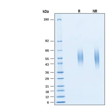 2 μg/lane of Biotinylated Recombinant Human B7‑H6 His-tag Avi-tag Protein (Catalog # AVI9309) was resolved with SDS-PAGE under reducing (R) and non-reducing (NR) conditions and visualized by Coomassie® Blue staining, showing bands at 50-58 kDa.Formulation, Preparation and Storage