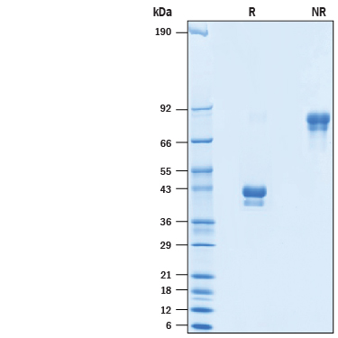 2 μg/lane of Recombinant Human BCMA/TNFRSF17 Fc Chimera Atto 488 (ATJ193) was resolved with SDS-PAGE under reducing (R) and non-reducing (NR) conditions and visualized by Coomassie® Blue staining, showing bands at 35-45 kDa and 70-90 kDa, respectively.Formulation, Preparation and Storage