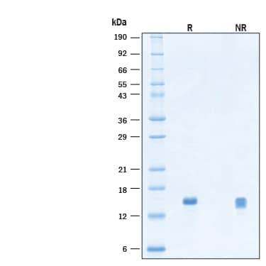 2 μg/lane of Recombinant Human Betacellulin/BTC Protein (Catalog # BT-BTC) was resolved with SDS-PAGE under reducing (R) and non-reducing (NR) conditions and visualized by Coomassie® Blue staining, showing bands at 12-15 kDa.Formulation, Preparation and Storage