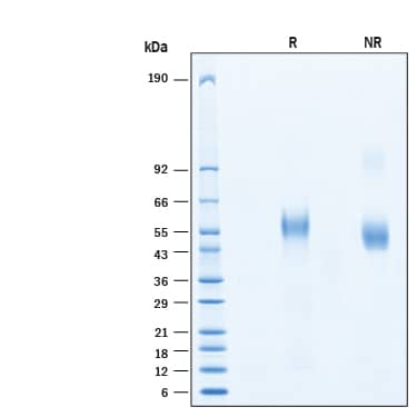 2 μg/lane of Recombinant Human CD19 His-tag Protein (Catalog # 11095-CD) was resolved with SDS-PAGE under reducing (R) and non-reducing (NR) conditions and visualized by Coomassie® Blue staining, showing bands at 50-65 kDa.