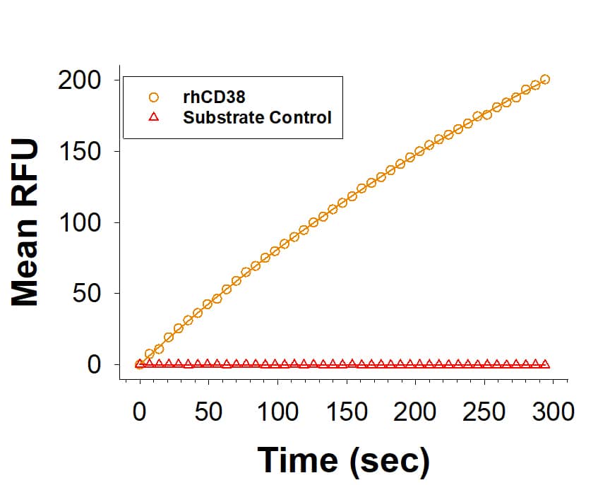 Biotinylated Recombinant Human CD-38 His-tag Protein (Catalog # BT2404) is measured by its ability to convert the substrate nicotinamide guanine dinucleotide (NGD+) to cyclic GDP-ribose.