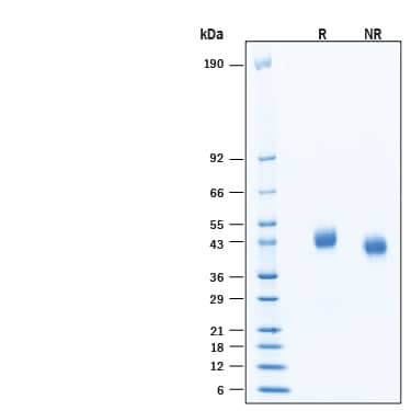 2 μg/lane of Biotinylated Recombinant Human CD38 His-tag Protein (Catalog # BT2404) was resolved with SDS-PAGE under reducing (R) and non-reducing (NR) conditions and visualized by Coomassie® Blue staining, showing bands at 40-44 kDa, under reducing conditions.