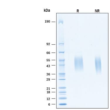 2 μg/lane of Biotinylated Recombinant Human CRACC/SLAMF7 His-tag Protein (Catalog # AVI11533) was resolved with SDS-PAGE under reducing (R) and non-reducing (NR) conditions and visualized by Coomassie® Blue staining, showing bands at 44-52 kDa, under reducing conditions.Formulation, Preparation and Storage