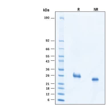 2 μg/lane of Recombinant Human EDA2R/TNFRSF27/XEDAR His-tag Protein (Catalog # 11358-XD) was resolved with SDS-PAGE under reducing (R) and non-reducing (NR) conditions and visualized by Coomassie® Blue staining, showing bands at 26-30 kDa.Formulation, Preparation and Storage