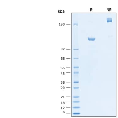 2 μg/lane of Recombinant Human ErbB2/Her2 Fc His Alexa Fluor® 647 Protein (Catalog # AFR1129) was resolved with SDS-PAGE under reducing (R) and non-reducing (NR) conditions and visualized by Coomassie® Blue staining, showing bands at 115-130 kDa and 230-260 kDa, respectively.Formulation, Preparation and Storage