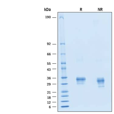 2 μg/lane of Recombinant Human Fc gamma RIIA/CD32a (R167) His-tag Alexa Fluor® 488 Protein (Catalog # AFG1330) was resolved with SDS-PAGE under reducing (R) and non-reducing (NR) conditions and visualized by Coomassie® Blue staining, showing bands at 26-36 kDa.Formulation, Preparation and Storage