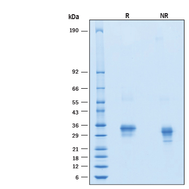 2 μg/lane of Recombinant Human Fc gamma RIIA/CD32a (R167) His-tag Alexa Fluor® 647 Protein (Catalog # AFR1330) was resolved with SDS-PAGE under reducing (R) and non-reducing (NR) conditions and visualized by Coomassie® Blue staining, showing bands at 26-36 kDa.Formulation, Preparation and Storage