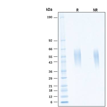 2 μg/lane of Recombinant Human Fc gamma RIIIB/CD16b His-tag Avi-tag Protein (Catalog # AVI11507) was resolved with SDS-PAGE under reducing (R) and non-reducing (NR) conditions and visualized by Coomassie® Blue staining, showing bands at 39-63 kDa, under reducing conditions.Formulation, Preparation and Storage
