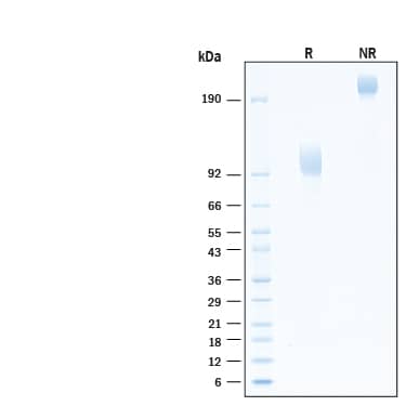 2 μg/lane of Biotinylated Recombinant Human FGFR2 alpha (IIIc) Fc Chimera Avi-tag Protein (Catalog # AVI712) was resolved with SDS-PAGE under reducing (R) and non-reducing (NR) conditions and visualized by Coomassie® Blue staining, showing bands at 90-110 kDa and 180-220 kDa, respectively.Formulation, Preparation and Storage