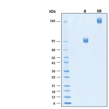 2 μg/lane of Biotinylated Recombinant Human FGFR4 Fc Chimera Avi-tag Protein (Catalog # AVI685) was resolved with SDS-PAGE under reducing (R) and non-reducing (NR) conditions and visualized by Coomassie® Blue staining, showing bands at 90-105 kDa and 180-210 kDa, respectively.Formulation, Preparation and Storage