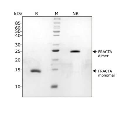 FRACTA migrates as a single band at 24 kDa in non-reducing (NR) and 13 kDa as a single monomeric species upon reduction (R). No contaminating protein bands are visible.Purified recombinant protein (1 µg) was resolved using 15% w/v SDS-PAGE in reduced (+ beta-mercaptothanol, R) and non-reduced conditions (NR) and stained with Coomassie Brilliant Blue R250.Formulation, Preparation and Storage
