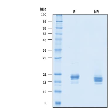 2 μg/lane of Recombinant Human IFN-alpha-2A Protein (Catalog # 10984-IF) was resolved with SDS-PAGE under reducing (R) and non-reducing (NR) conditions and visualized by Coomassie® Blue staining, showing bands at 18-24 kDa.Formulation, Preparation and Storage