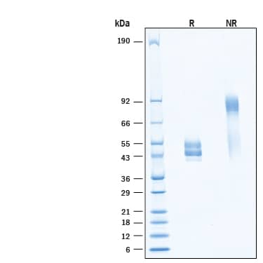 2 μg/lane of Recombinant Human IgE Fc His-tag Protein (Catalog # 11647-IE) was resolved with SDS-PAGE under reducing (R) and non-reducing (NR) conditions and visualized by Coomassie® Blue staining, showing bands at 40-56 kDa, under reducing conditions.