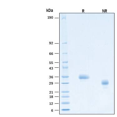 2 μg/lane of Recombinant Human IL‑12 p35 (C96S) Protein (Catalog # 11209-IL) was resolved with SDS-PAGE under reducing (R) and non-reducing (NR) conditions and visualized by Coomassie® Blue staining, showing bands at 28-37 kDa.Formulation, Preparation and Storage