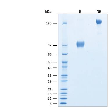 2 μg/lane of Biotinylated Recombinant Human IL-17RA/IL-17R Fc Chimera Avi-tag Protein (Catalog # AVI177) was resolved with SDS-PAGE under reducing (R) and non-reducing (NR) conditions and visualized by Coomassie® Blue staining, showing bands at 90-100 kDa and 180-200 kDa, respectively.