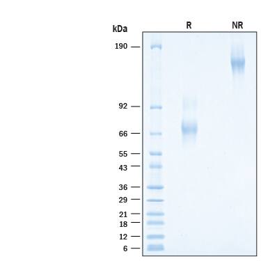 2 μg/lane of Biotinylated Recombinant Human IL‑18 BPa Fc Chimera Avi-tag Protein (Catalog # AVI119) was resolved with SDS-PAGE under reducing (R) and non-reducing (NR) conditions and visualized by Coomassie® Blue staining, showing bands at 65 - 76 kDa & 91-101 kDa and 130-155 kDa & 180 - 200 kDa respectively.