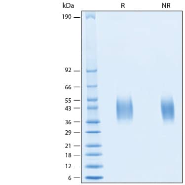 2 μg/lane of Recombinant Human IL-20R alpha His-tag Protein (Catalog # 11239-IR) was resolved with SDS-PAGE under reducing (R) and non-reducing (NR) conditions and visualized by Coomassie® Blue staining, showing bands at 34-45 kDa.Formulation, Preparation and Storage