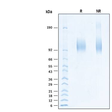 2 μg/lane of Recombinant Human IL-31RA Avi-tag His-tag Protein (Catalog # AVI2769) was resolved with SDS-PAGE under reducing (R) and non-reducing (NR) conditions and visualized by Coomassie® Blue staining, showing bands at 90-105 kDa, under reducing conditions..Formulation, Preparation and Storage
