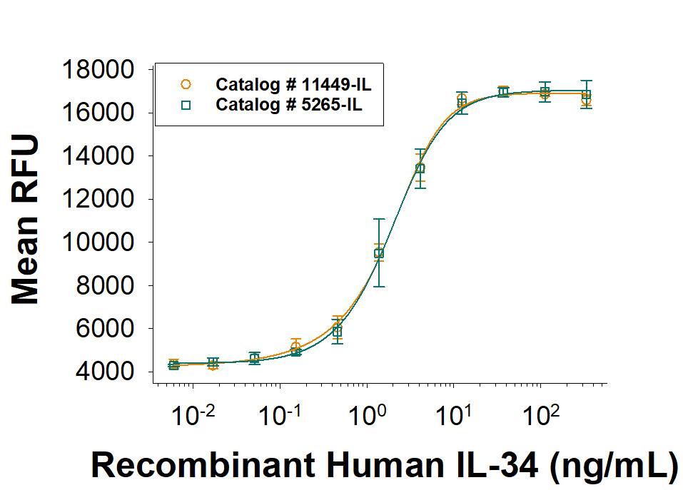 Equivalent bioactivity of Recombinant Human IL-34 His-tag Protein (Catalog # 11449-IL) and Recombinant Human IL-34 Protein (5265-IL) as measured by its ability to induce CCL2/MCP-1 secretion by human peripheral blood mononuclear cells (PBMC).Formulation, Preparation and Storage