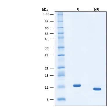 2 μg/lane of Recombinant Human IL‑4 GMP Protein (Catalog # BT-004-GMP) was resolved with SDS-PAGE under reducing (R) and non-reducing (NR) conditions and visualized by Coomassie® Blue staining, showing bands at 13 kDa under reducing conditions.Formulation, Preparation and Storage