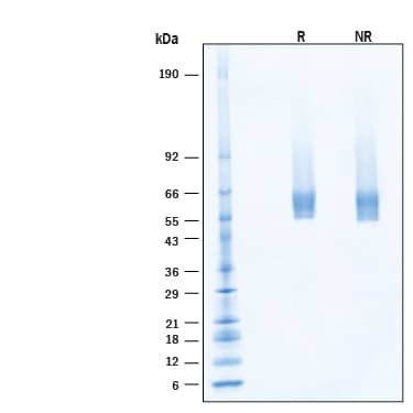 2 μg/lane of Biotinylated Recombinant Human IL‑5 R alpha/CD125 Avi-tag His-tag Protein (Catalog # AVI11394) was resolved with SDS-PAGE under reducing (R) and non-reducing (NR) conditions and visualized by Coomassie® Blue staining, showing bands at 52-63 kDa, under reducing conditions.Formulation, Preparation and Storage