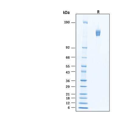 2 μg/lane of Recombinant Human Integrin alpha 4 beta 1 Fc Chimera Protein (Catalog # 11719-A4) was resolved with SDS-PAGE under reducing (R) condition and visualized by Coomassie® Blue staining, showing bands at 128-155 kDa.Formulation, Preparation and Storage