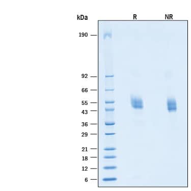 2 μg/lane of Recombinant Human KIR3DL1 His-tag Protein (Catalog # 11101-KR) was resolved with SDS-PAGE under reducing (R) and non-reducing (NR) conditions and visualized by Coomassie® Blue staining, showing bands at 45-58 kDa.Formulation, Preparation and Storage