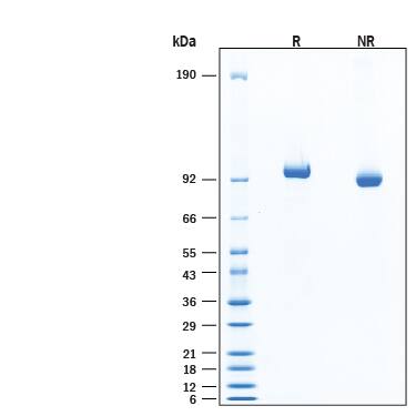 2 μg/lane of Biotinylated Recombinant Human MMP‑9 His-tag Avi-tag Protein (Catalog # AVI911) was resolved with SDS-PAGE under reducing (R) and non-reducing (NR) conditions and visualized by Coomassie® Blue staining, showing bands at 90-100 kDa under reducing conditions.Formulation, Preparation and Storage