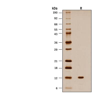 1 μg/lane of Recombinant Human/Mouse/Rat GDF‑8/Myostatin Protein (Catalog # 11658-G8) was resolved with SDS-PAGE under reducing (R) condition and visualized by silver staining, showing bands at 10-14 kDa.Formulation, Preparation and Storage