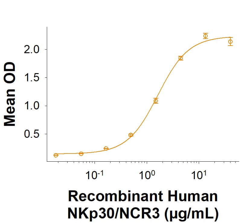 When Recombinant Human B7-H6 Fc Chimera (Catalog # 7144-B7) is immobilized at 4 µg/mL (100 µL/well), Recombinant Human NKp30/NCR3 His-tag (Catalog # 11271-NK) binds with an ED50 of 0.600-7.20 µg/mL.