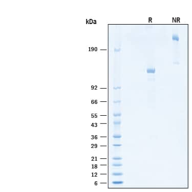 2 μg/lane of Recombinant Human Siglec‑2/CD22 Fc Chimera Alexa Fluor® 488 Protein (Catalog # AFG1968) was resolved with SDS-PAGE under reducing (R) and non-reducing (NR) conditions and visualized by Coomassie® Blue staining, showing bands at 128-141 kDa and 256-282 kDa, respectively.Formulation, Preparation and Storage