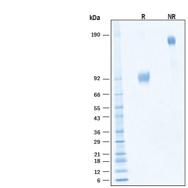 2 μg/lane of Recombinant Human SIRP alpha/CD172aFc Chimera Alexa Fluor® 488 Protein (Catalog # AFG4546) was resolved with SDS-PAGE under reducing (R) and non-reducing (NR) conditions and visualized by Coomassie® Blue staining, showing bands at 70-105 kDa and 140-210 kDa, respectively.Formulation, Preparation and Storage