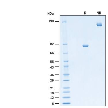 2 μg/lane of Recombinant Human TAPBPR Fc Chimera Protein (Catalog # 11171-TP) was resolved with SDS-PAGE under reducing (R) and non-reducing (NR) conditions and visualized by Coomassie® Blue staining, showing bands at 75-90 kDa and 150-180 kDa, respectively.